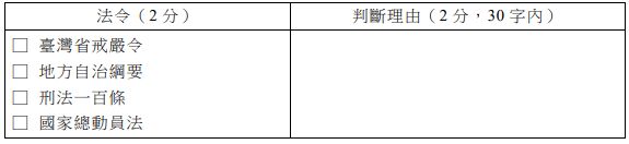 52. 依據題文及你的歷史知識,戰後政府有許多管制臺灣社會文化的手段,這些手段與下列哪個法令的施行最有關?請在答題卷勾選一個正確選項,並說明判斷理由。(4 分)