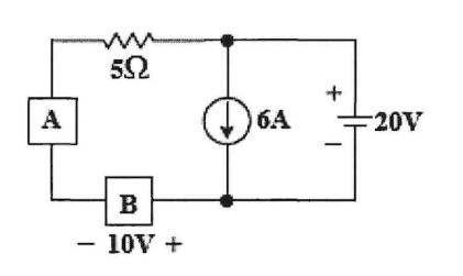 2.如圖所示電路,若已知20V電壓源消耗功率80W,則下列敘述何者有錯誤?(A)電路總消耗功率P為800W(B)6A電流源消耗功率為120W(C)元件A消耗功率為800W(D)元件B消耗功率為100W