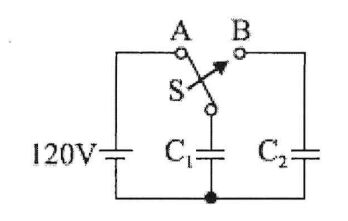 6.如圖所示電路,電容C各10μF,開關S由A點切到B端,已知電容 \( C_2 \) 之初始電壓值為0V,試求電容 \( C_2 \) 之電壓?(A)10V(B)12V(C)14V(D)24V