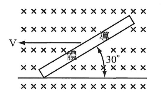 15.如圖所示,磁通密度為5韋伯\/平方公尺(×表示磁場方向),導體長度2公尺,以3公尺\/秒速率前去移動(如V方向),則其感應電勢為:(A)0(B)10(C)15(D)17.32 V