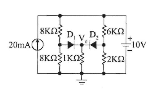 16.如圖所示電路,二極體具理想特性,試求 \( V_o \) 之值約為何?(A)1.11V(B)1.52V(C)2.52V(D)3.22V