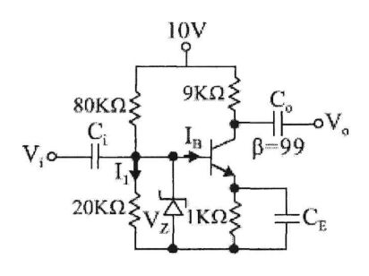 17.如圖所示電路,電晶體 \( V_{BE}=0.7V \),\( V_{CE(sat)}=0.2V \) 且飽和,二極體(Zener)崩潰電壓 \( V_Z=4V \),則電流 \( I_a \) 為何?(A)11.3μA(B)13.3μA(C)15μA(D)20μA