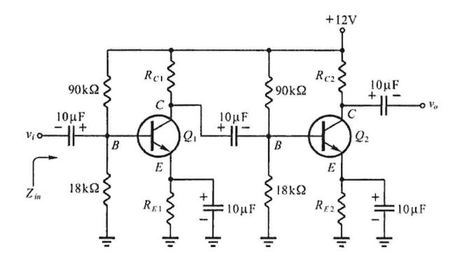 18.如圖所示電路,電晶體 \( Q_1 \) 之β為199,\( Q_2 \) 之β為99,\( V_{BE} \) 均為0.7V,\( V_T=26mV \),\( R_1=1.3k\Omega \),\( R_2=663\Omega \),各電晶體均操作在主動區,輸入阻抗 \( Z_{in} \) 約為?(A)7.8kΩ(B)4.02kΩ(C)2.74kΩ(D)1.8kΩ