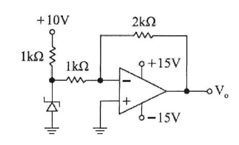 19.如圖所示電路,OPA為理想運算放大器,已知穩壓二極體(Zener)崩潰電壓 \( V_Z=6V \),試求輸出電壓 \( V_o \) 為何?(A)-6V(B)-10V(C)-12V(D)-15V