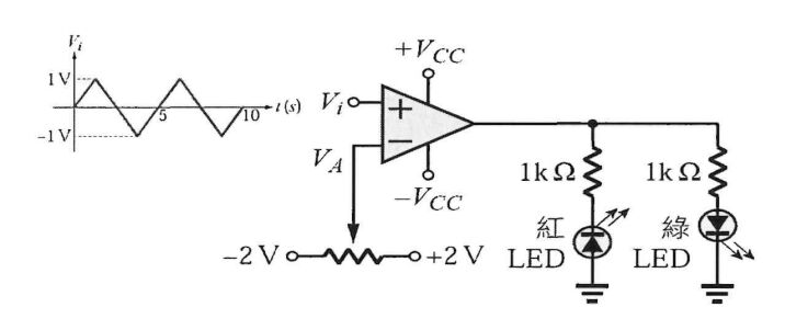 25.如圖所示電路,設 \( V_i \) 為振幅1V之對稱三角波,運算放大器為理想運算放大器,若紅色LED亮2秒,綠色LED亮3秒,重複持續觸發,則 \( V_i \) 電壓應調整為:(A)-0.1V(B)0.1V(C)0.2V(D)0.3V