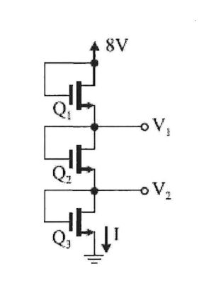 3.如圖所示電路,這所有電晶體Q1、Q2、Q3的參數 \( V_t=1V \),\( \mu_n C_{ox}=20mA\/V^2 \),電晶體參數 \( K = \frac{1}{2} \mu_n C_{ox} \frac{W}{L} \)。已知電路正常工作時,穩態電流I=40mA,\( V_1=5V \),\( V_2=3V \),試求三個電晶體的通道寬長比 \( (W\/L)_1 : (W\/L)_2 : (W\/L)_3 \) = ___