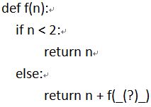 68.給定右側函式 f( ),已知 f(14)、f(10)、 f(6)分別回傳 25、18、10,函式中的 (?) 應為下列何者?[APCS114](A) (n+1)//2 (B) n//2 (C) (n-1)//2 (D) (n//2)+1