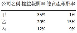40.下列為甲、乙、丙三家公司 20X6 年度的權益報酬率和總資產報酬率:假設 20X6 年以後,景氣持續轉壞,預估將歷時數年,則哪一家公司盈餘衰退的速度會比較快?(A)甲(B)乙(C)丙(D)完全無法預測