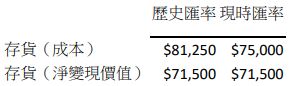 70.甲公司所有以外幣計價之存貨,以現時匯率及歷史匯率轉換為能性貨幣之金額如下表:請問公司當年度資產負債表中存貨之餘額應為多少? (A)$81,250(B)$78,000(C)$75,000(D)$71,500