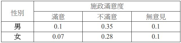 2 從臺北市市民中抽樣 300 位調查其對臺北市的施政滿意度,調查結果如下:從其中任取一人,若已知抽出者為女性,則其滿意之機率約為何? (A) 0.41 (B) 0.07 (C) 0.36 (D) 0.16