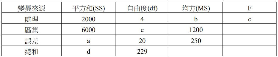 27 下表為隨機區集設計(Randomized Block Design)部分的 ANOVA 表:ANOVA 表中 a, b, c, d, e 約多少,下列何者正確? (A) a, b, e 分別約為 5000, 500, 5 (B) a, b, e 分別約為 8000, 500, 5 (C) b, c, d 分別約為 500, 3, 9000 (D) a, c, d 分別約為 5000, 1.8, 13000