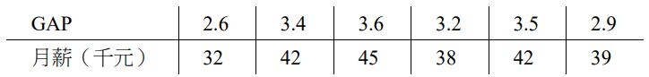 34 某商管學院收集 6 位學生獲得商管學士學位時的 GAP 成績(x),以及起薪(第一份薪水)的月薪(y)資料如下:根據上面資料,直線迴歸模式 y=β0 + β1X的估計迴歸方程式為 = 4.64 + 10.95 ,並且 MSE= 3.17。 檢定H0 : β1=0 vs Ha:β1 ≠ 0,使用的檢定統計量約為何? (A) t =0.697 (B) t = -0.697 (C) t = 5.29 (D) t = 3.43