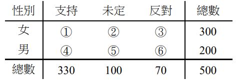 36 承上題,請問列聯表之對應期望次數表中①、②、③、④、⑤、⑥依序分別是? (A)(198, 55, 40, 130, 40, 28) (B)(198, 60, 40, 130, 40, 28) (C)(198, 60, 42, 132, 40, 28) (D)(198, 55, 42, 132, 40, 28)