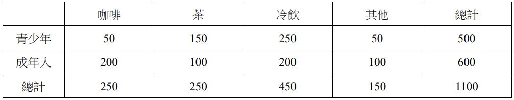 39 下表為青少年與成年人飲料偏好數據,用來檢定不同年齡層與飲料偏好之間是否獨立。在給定顯著水準為 0.05 下,臨界值為何? (A) 6.251 (B) 7.815 (C) 12.592 (D) 14.449
