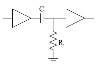 7 如圖,放大器與放大器串接之耦合電容器 C 與後級放大器的輸入電阻 Ri 一起作用會形成何種電路響應? (A)低通電路響應 (B)帶通電路響應 (C)高通電路響應 (D)全通電路響應