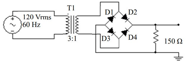 14 圖為全波橋式整流器,二極體的切入電壓為 0.7 V,輸入為 120 Vrms 之正弦波,當 D2、D3 導通時,D1 和 D4 受到的逆向峰值電壓(PIV)約為何? (A) 27.58 V (B) 39.3 V (C) 119.3 V (D) 55.86 V
