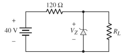 15 如圖所示稽納二極體(Zener Diode)電路,若稽納電壓 VZ = 11 V 及稽納內電阻為 0 Ω,則稽納二極體所消耗的最大功率約為何(RL=∞)? (A) 1.45 W (B) 2.65 W (C) 5.45 W (D) 8.15 W