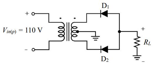 16 如圖所示電路,輸入弦波電壓峰值為 110 V,變壓器線圈匝數比為 10:1,假設二極體導通電壓為 0.7 V, 負載電阻 RL 電壓的峰值為何? (A) 4.8 V (B)-4.8 V (C) 10.3 V (D)-10.3 V