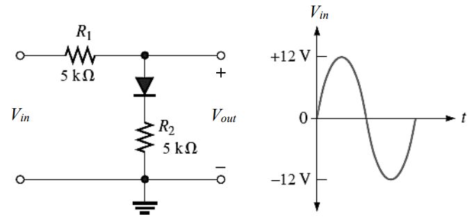 19 如圖所示電路,圖中的正弦波為輸入電壓,若二極體的切入電壓為 0.7 V,則其最大輸出電壓為何? (A)0V (B) 0.7 V (C) 5.55 V (D) 6.35 V