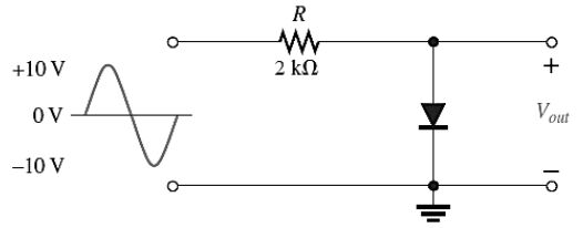 20 如圖所示電路及輸入波形,假設二極體的切入電壓為 0.7 V,則輸出電壓的上限為何? (A)-0.7 V (B)0V (C) 0.7 V (D) 10 V