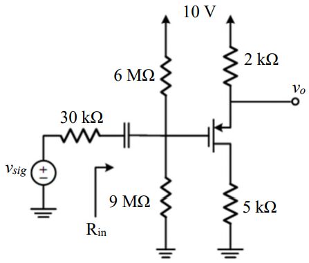 31 圖中放大器電路中電晶體的 VTH= -1 V,μpCox(W/L)=2 mA/V2 ,放大器的輸入電阻 Rin 為何? (A) 2 kΩ (B) 3.6 MΩ (C) 9 MΩ (D)∞ Ω