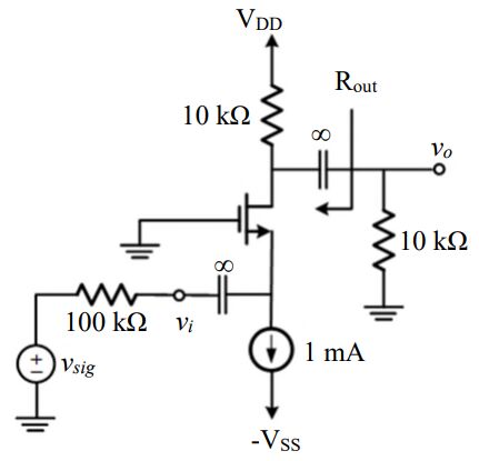 32 圖中放大器電路中電晶體的 VTH= 1 V,VA=∞ V,μnCox(W/L)=2 mA/V2,放大器的輸出電阻 Rout 為何? (A) 0.5 kΩ (B) 1 kΩ (C) 5 kΩ (D) 10 kΩ