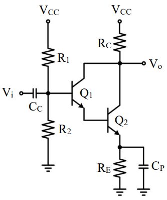 34 如圖所示 R1=335 kΩ,R2=125 kΩ,RC=2.2 kΩ,RE=1 kΩ。已知電晶體 Q1 之 β1=100,rπ1 =200 kΩ;電 晶體 Q2 之 β2=100,rπ2 =2 kΩ。求此電路之電壓增益 Vo/Vi 約為何? (A)-55.82 (B)-5.82 (C) 5.82 (D) 55.82