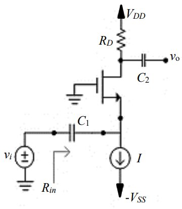 40 圖示電路,若電晶體的 μnCox(W/L)= 20 mA/V2 ,RD = 10 kΩ,I = 0.1 mA,則輸入阻抗 Rin 約為何?(A) 50 Ω (B) 100 Ω (C) 250 Ω (D) 500 Ω