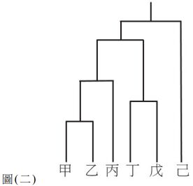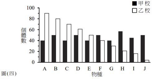 31. 小沛對甲、乙兩校園內進行為期一個月的昆蟲物種調查,結果如圖 ( 四 ) 所示。根據 生物多樣性的概念,下列敘述何者正確? (A) 兩校昆蟲總數與環境承載量皆相近 (B) 兩校物種數相同,所以物種多樣性相同 (C) 甲校物種均勻度與物種多樣性高於乙校 (D) 乙校具優勢種和稀有種,物種多樣性高於甲校