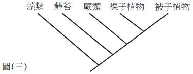 29. 陸生植物為適應乾燥環境,發展出許多特徵。根據圖 ( 三 ) 的演化樹,下列何種構造的 演化,最先讓植物能適應陸地的缺水環境? (A) 演化出維管束,以加速水分運輸 (B) 產生孢子,以保護遺傳物質 (C) 形成具胚珠的種子,減少水分依賴 (D) 發展出角質層,覆蓋植物體表面