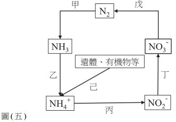 34. 氮循環為氮元素在自然界中將大氣中的氮氣轉變為生物可利用的含氮化合物,並經由生物體利用與分解後,再回到大氣中的過程,有關氮循環的相關應用與圖 ( 五 ) 所示各階段作用,下列何者錯誤? (A) 農夫施用尿素肥料與己反應有關 (B) 水族缸中培養亞硝化及硝化細菌的主要目的與丙、丁反應有關 (C) 水質優養化的發生與戊反應有關,造成水底中氮氣過多導致藻類大量繁殖 (D) 哈伯法人工固氮與甲反應有關,並經由乙轉化成植物可吸收的形式
