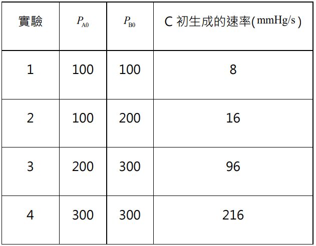 2. 已知 2A(g)+B(g) → 2C(g)+熱,以 mmHg 為氣體分壓的單位,且 A、B 初期的壓力用 PA0、PB0 代表。實驗得到速率 如附表。試問:如實驗第一組取量,但將容器體積縮減為原先的一半,則 B 的消耗速率應為____________mmHg/s。