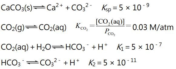 9. 鈣離子是河流和湖泊中最常見的陽離子。它來自方解石(主要成分為碳酸鈣),在 CO2 與水的作用下溶解生成[HCO3 -]=2[Ca2+]。在接近中性 pH 值時,大部分情況下生成碳酸氫鹽,而非碳酸鹽或碳酸。已知鈣離子會在以下的反應中生成並 達到平衡,若大氣中 CO2 的分壓為 0.0004 atm,則此時海洋中的[Ca2+]約為多少 M?______________