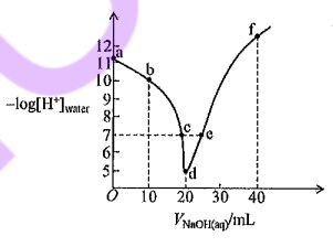 21. At room temperature, 0.10 M NaOH solution is added dropwise to 20 mL of 0.10 M CH3COOH solution. The relationship between the negative logarithm of the H+ concentration originating from the autoionization of 5- water, -log[H+]water, and the volume of 10 20 30 40 VNOH(ag/nL NaOH solution added is shown in the graph on the right. Assuming that the volume change upon mixing can be neglected, which of the following statements is correct?