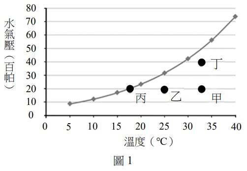 4.圖1為飽和水氣壓曲線圖,甲、乙、丙、丁分別代表4種大氣狀態,甲、乙、丙有相同的水氣壓,甲和丁有相同的溫度。下列敘述何者正確?