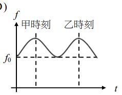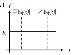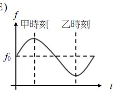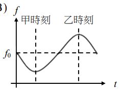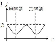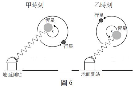 13.2019年諾貝爾物理獎主題之一為對太陽系外行星系統的探究。實際上某一行星與某恆星皆以x點為圓心作圓周運動,如圖6所示。在甲時刻,該恆星接近地球。在乙時刻,該恆星遠離地球。已知在實驗室中,靜止光源發出與該恆星相同光譜線的頻率為f0。若地面測站與該恆星繞行的圓軌道共平面,則該恆星發出的相同光譜線,從地面測站觀測,所測得頻率f隨時間t的變化最接近下列何者?