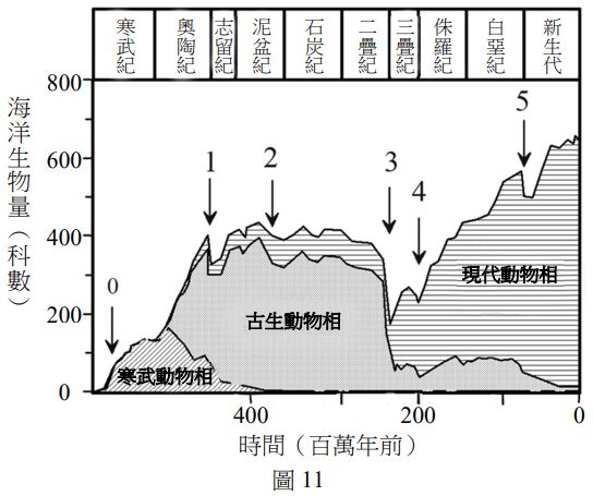 34.古生物學家舍科斯基(Sepkoski)教授將海洋生物化石多樣性歸納為三個動物相。以科為單位,他列舉了地球生命史上的五次大滅絕如圖11之數字1~5所示。依其歸納及後來的科學發展,下列敘述何者正確?