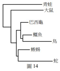 39.Dmrt1基因從「共同祖先」之祖先型演化出線蟲、昆蟲和魚類,乃至兩生類、爬蟲類、鳥類和哺乳類等不同衍生型的版本,形成一個基因族。發展至今,此基因族是一個高度保守(即大體上維持與過去相同),而且其成員間能忠實反映類群演化的分子性狀。今以巴西龜的Dmrt1基因對青蛙、大鼠、蛇、蜥蜴、鱷魚及鳥的同源DNA做親緣分析,得圖14,則下列圖示哪些合理?(應選2項)