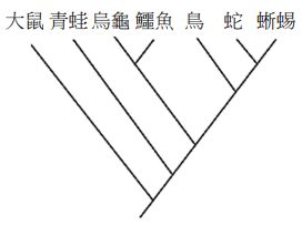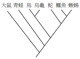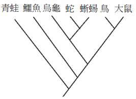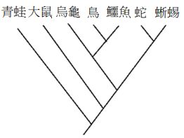 36.分子生物學發達前,圖12表示現生四足類合理的親緣關係之一。科學家在侏羅紀的地層發現一塊恐龍之長骨,並從骨腔中採樣。假設此採樣可獲得約200個鹼基對的DNA序列,若將此序列與現生生物之序列比對並推論之,則該恐龍最可能插入圖中的哪一分支,形成新的節點?
