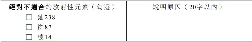 54.若要透過定年方法來瞭解隕石的形成時間,請於下表勾選絕對不適合的放射性元素,並試由半衰期、母元素與子元素的測量限制來說明原因(20字以內)?(於答題卷作答)