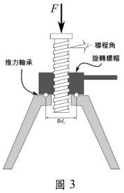 29. 一螺旋角為 23°,摩擦係數為 0.3,試判斷此螺旋當軸向載荷加在螺桿軸向時,螺桿是否會因外力而滑動? (A)是 (B)否 (C)視軸向施力大小而定,若施力足夠大則會滑動 (D)需要更多資料如有無潤滑才能判定