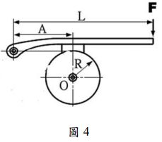 16. 一單塊制動器如圖 4,已知操作力經槓桿作用後,使制動塊對輪產生 1000 N 正壓力。若摩擦係數為 0.35 ,制動輪直徑為 400 mm,則其制動力矩約為多少? (A)70 N·m (B)105 N·m (C)140 N·m (D)280 N·m