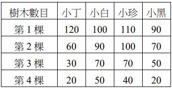 11 小丁、小白、小珍及小黑 4 人對種植 4 棵樹的願付最高價格如下表。但種 植每棵樹的成本為 320 元,且 4 人決定平均分攤種樹的成本。則誰會反對 種 2 棵樹?