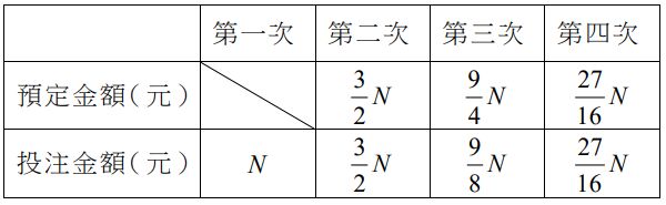 5. 某人購買公益彩券,第一次以 N 元為投注金額。之後每次要投注時,先將前次投注金額增加一半設為預定金額。如果預定金額大於 2N 元,則將預定金額減少一半投注;否則就以預定金額投注。前四次投注紀錄如下表: 試選出此人第七次的投注金額為多少元。 (A) (B) (C) (D) (E)