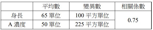 10. 某研究探討昆蟲的身長與其體內兩種養分 A、B 濃度的關係。研究中蒐集某種昆蟲,測得牠們身長與體內 A 濃度的數據如下表。已知每隻昆蟲體內的 B 濃度均為 A 濃度的 0.5 倍。試選出正確的選項。(A) B 濃度的標準差為單位(B) 若身長的中位數為 65 單位,則 B 濃度的中位數為 25 單位(C) B 濃度與 A 濃度的相關係數為 0.5(D) 若找到一身長為 65 單位的昆蟲,利用 A 濃度對身長的迴歸直線(最適直線)預測,其體內 A 濃度為 50 單位(E) B 濃度(Y)對身長(X)的迴歸直線斜率為