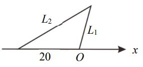 13. 坐標平面上,L1為通過原點 O 且斜角為 75的直線;L2為通過點 ( -20,0) 且斜角為30°的直線, 如圖所示。則 L1、 L2的交點到原點的距離為 。(四捨五入至整數)