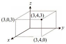 17. 利用單點透視法將坐標空間的點繪製在畫布的坐標平面上。已知(一)空間中與 y 軸平行的直線,在畫布上的消失點為 (0,15)(二)空間中與 z 軸平行的直線,在畫布上都與 y 軸平行若點 (0,0,0) 、 (3,4,0) 、 (3,0,3) 繪在畫布上分別為 (0,0) 、 ( )、 (3,3) ,則點 (3,4,3)繪在畫布上的 y 坐標為。(化為最簡分數)(註:右圖為三點 (3,4,0) 、 (3,0,3) 、 (3,4,3) 於坐標空間的位置關係)