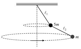 3.兩條長度固定為ℓ₁、ℓ₂,且質量可忽略不計的細繩,分別繫著質量為5m和m的質點,兩質點以相同的角速度繞同一鉛直線作水平等速圓周運動。已知重力加速度為g,兩繩的張力分別為T₁及T₂,兩繩與鉛直線夾角的正弦值分別是。兩細繩長度的比值為何?