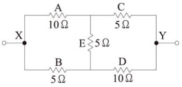 4.如圖所示的電路,已知A、B、C、D、E五個電阻分別為10Ω、5Ω、5Ω、10Ω、5Ω,以克希何夫定則計算X和Y兩點間的等效電阻為何?