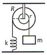 7.如圖所示,輪軸不計質量,半徑分別為R及r,彈簧力常數k,另一端繫一質量m之木塊平衡後,將木塊拉下一小段距離後釋放,求木塊振動的週期為何?